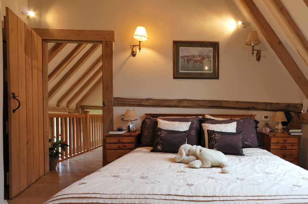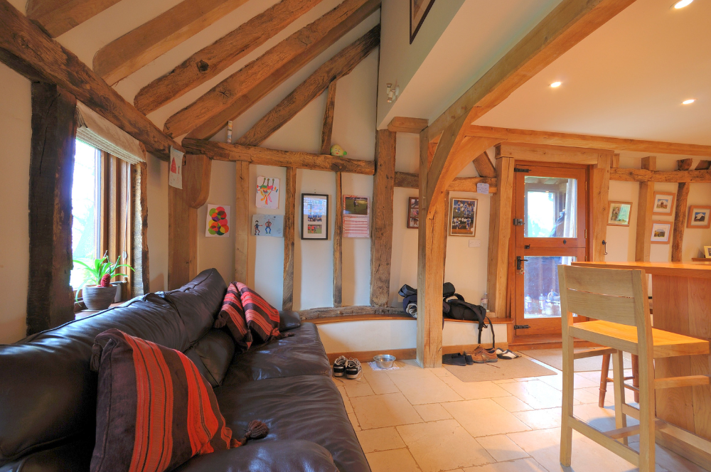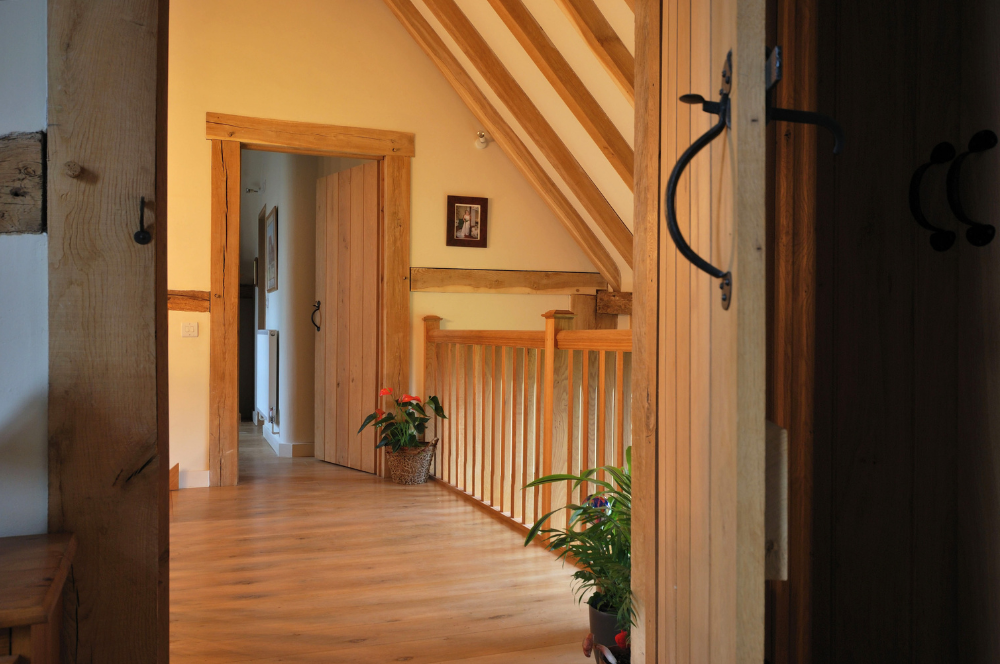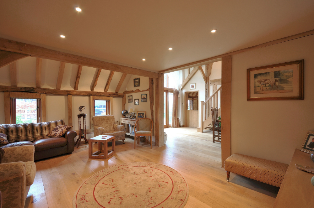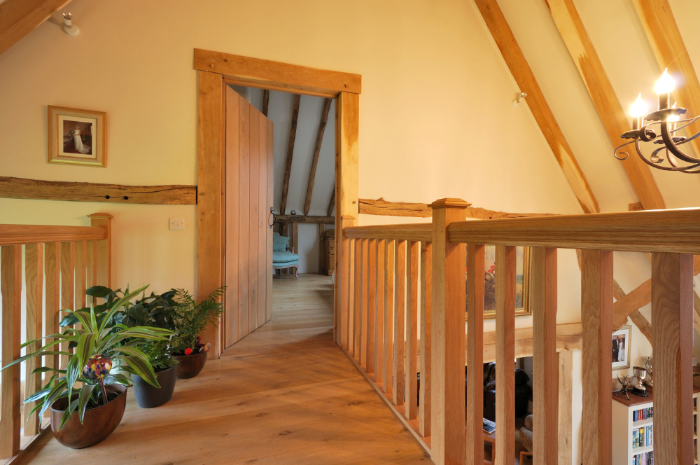 The result is a lovely barn conversion, which combines the rustic nature of the original oak frame with new oak supporting structures to create a series of unique and individual spaces.
