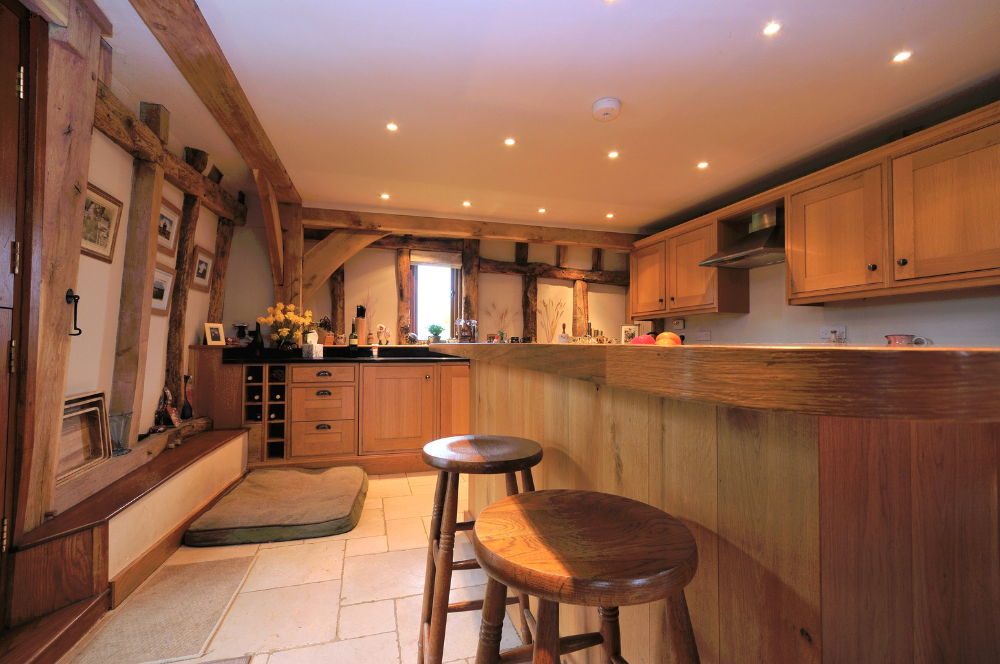 Keeping as much oak on show as possible meant the plastering was a time-consuming and detailed job. However, it was worth it – the final effect is stunning and really showcases the existing structure.